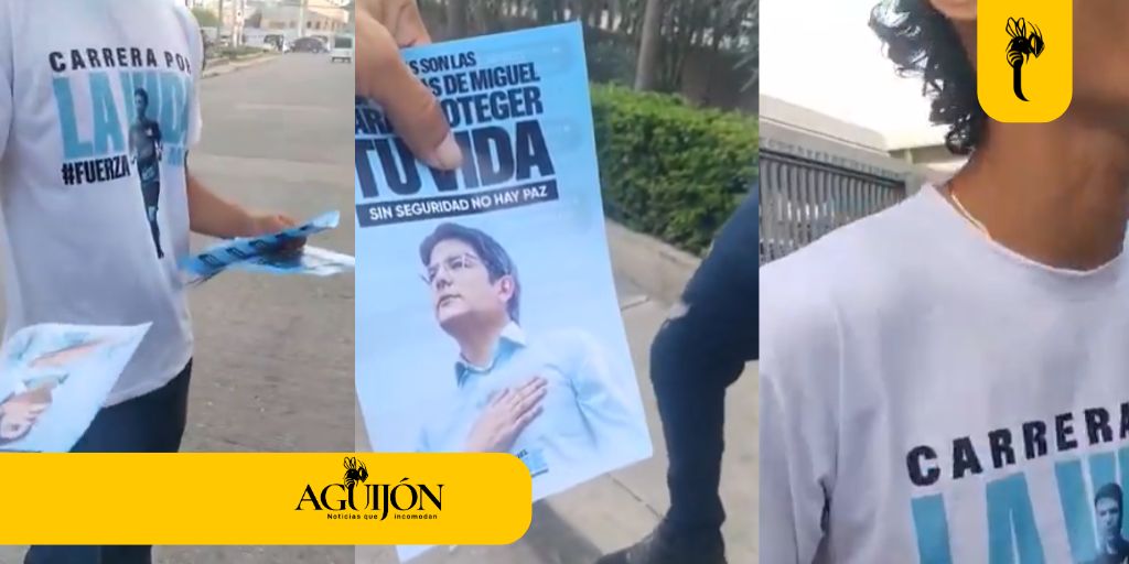 A pesar de que los jóvenes llevan publicidad de la “Carrera por la Vida” los volantes hacen publicidad de sus propuestas de campaña. “Estas son las propuestas de Miguel para proteger tu vida” acompañado del slogan “sin seguridad no hay paz”, lo que indica claramente que no se trata de una oración por la salud de Uribe sino de publicidad de su campaña presidencial.
