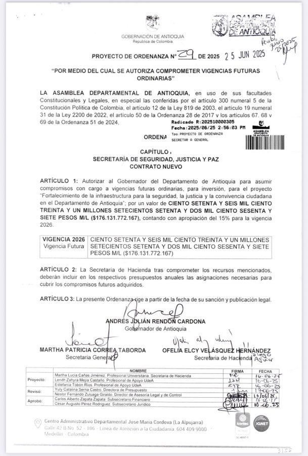 El gobernados de Antioquia pretende gastarse en 2025 mas de 176.000 millones de pesos del impuesto a la seguridad que se recogería en 2026. Esa cifra aún no se ha recogido y es casi seguro que el impuesto se caiga por vicios de forma y de fondo.