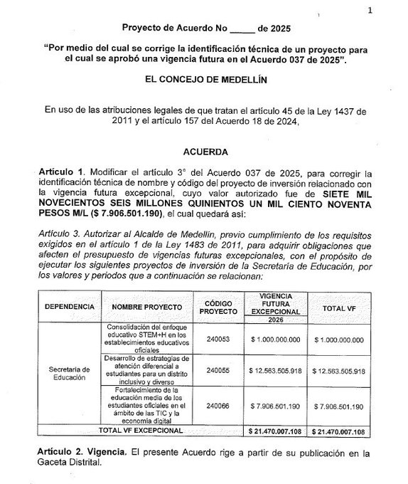 Se trata del proyecto de acuerdo 067 de 2025, que según el único concejal de oposición José Luis Marín, cambia de destinación el sentido del gasto, pues inicialmente (aunque sin debate) se había promovido para la formación técnica laboral y se cambia a fortalecimiento en TIC y economía digital lo que no es equivalente.