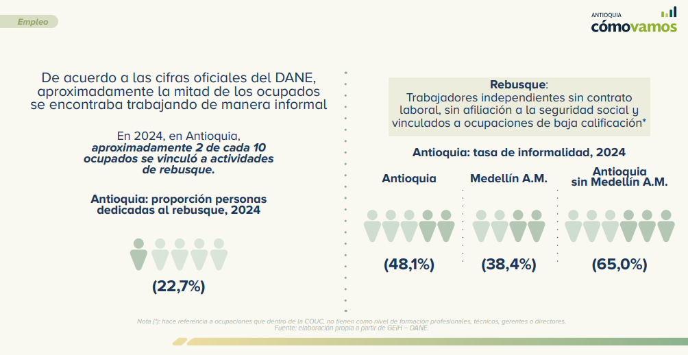 Antioquia Cómo Vamos aseguró que en el departamento en 2024, aproximadamente 2 de cada 10 ocupados se vinculó a actividades de rebusque, entendido como el trabajo de todas aquellas personas que son “trabajadores independientes sin contrato laboral, sin afiliación a la seguridad social y vinculados a ocupaciones de baja calificación”.