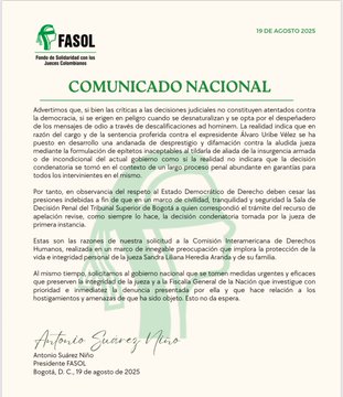 El Fondo de Solidaridad con el poder Judicial Colombiano, FASOL, solicitó a la Comisión Interamericana de DDHH que se proteja la vida de la Juez Sandra Heredia, pues la condena al ex presidente Uribe le ha acarreado una serie de amenazas contra ella y contra su familia.