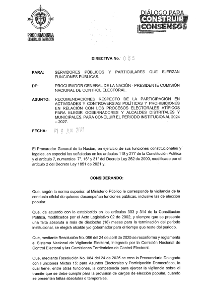 “La medida es adoptada a partir de las manifestaciones públicas realizadas en las últimas horas en redes sociales, específicamente en X, lo que podría indicar que se está incurriendo en una aparente intervención indebida de cara a las elecciones que se aproximan en el país, comportamiento prohibido para los servidores públicos.” Nota de Prensa de la Procuraduría.