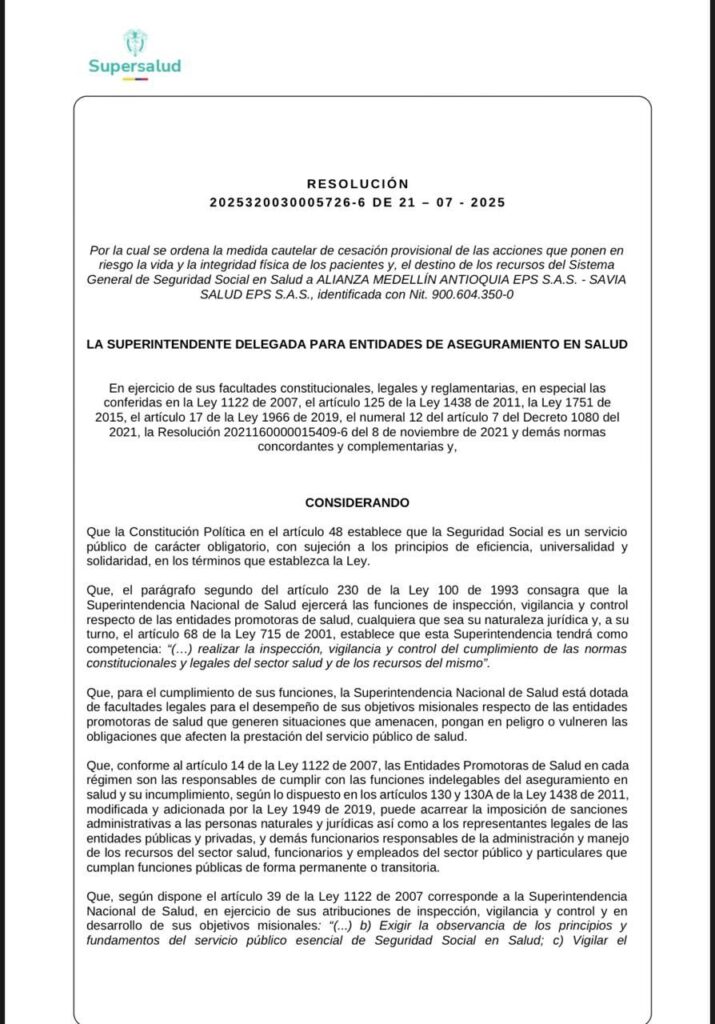 La medida de la Supersalud fue anunciada este Lunes como medida cautelar ante el incumplimiento de la EPS en la entrega de los medicamentos y otros insumos necesarios para atender las necesidades en salud de miles de personas que se han visto afectadas por la incompetencia de la EPS.