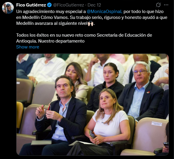 El anuncio del nuevo puesto de Mónica Ospina Londoño se hizo público por parte de la gobernación esta semana y en una fotografía de Federico Gutiérrez celebró el nombramiento. Considerando el álgido momento en que la derecha de Antioquia está construyendo un nicho de oposición, resultan apenas naturales las críticas pues parece que en lugar de estar haciendo veeduría estaban allanando el camino de la oposición para las elecciones.